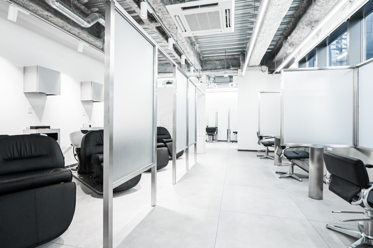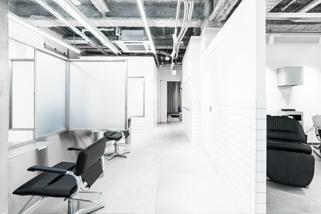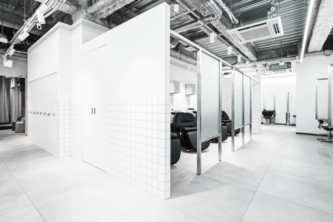 店内は、スタイル撮影に適した内装・素材・照明計画を取り入れ、すりガラスの個室仕切りにより奥行きのある写真表現も可能。ラウンジスペースとカラーラボも独立して配置しており、働きやすさを徹底的に追求した空間設計です。