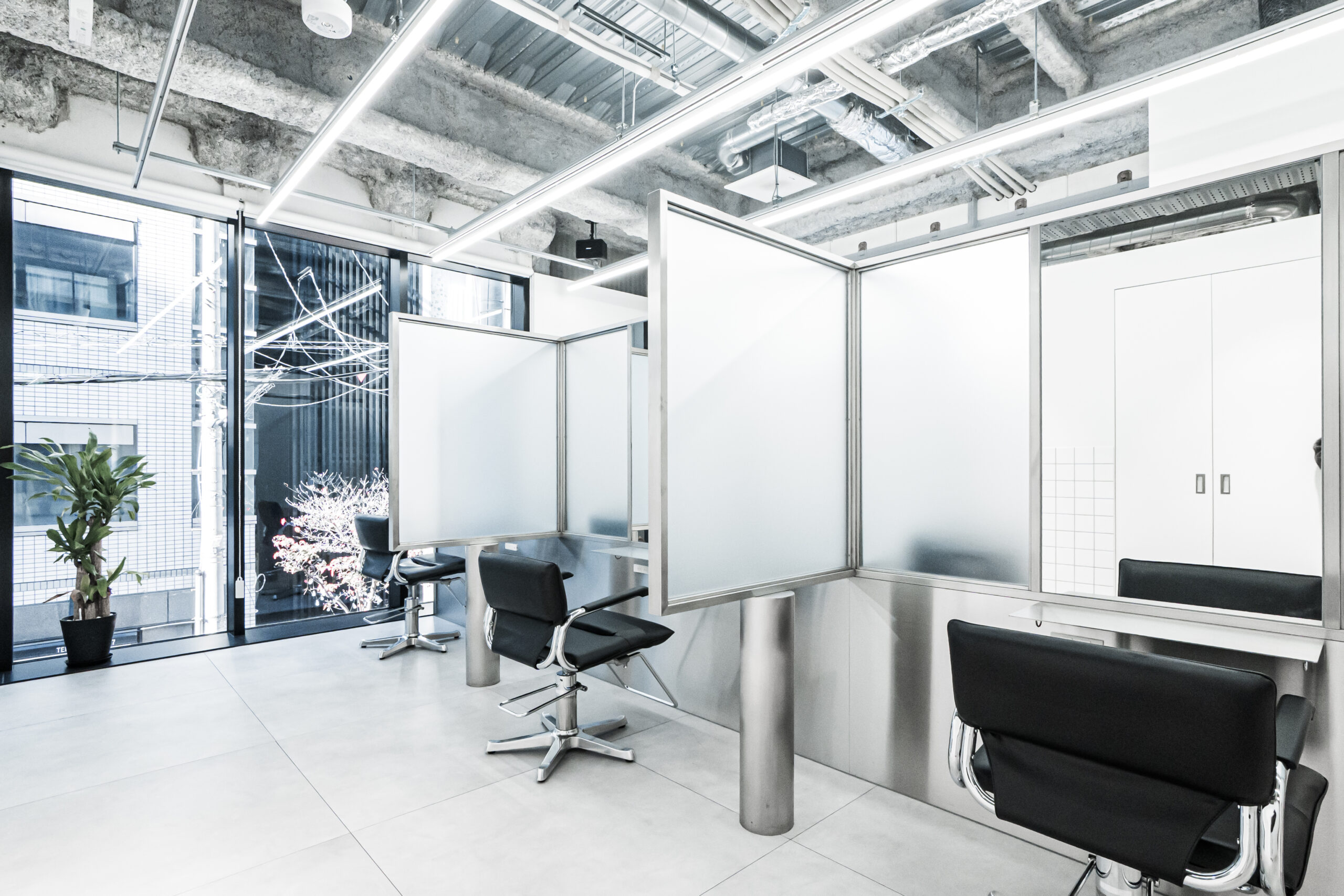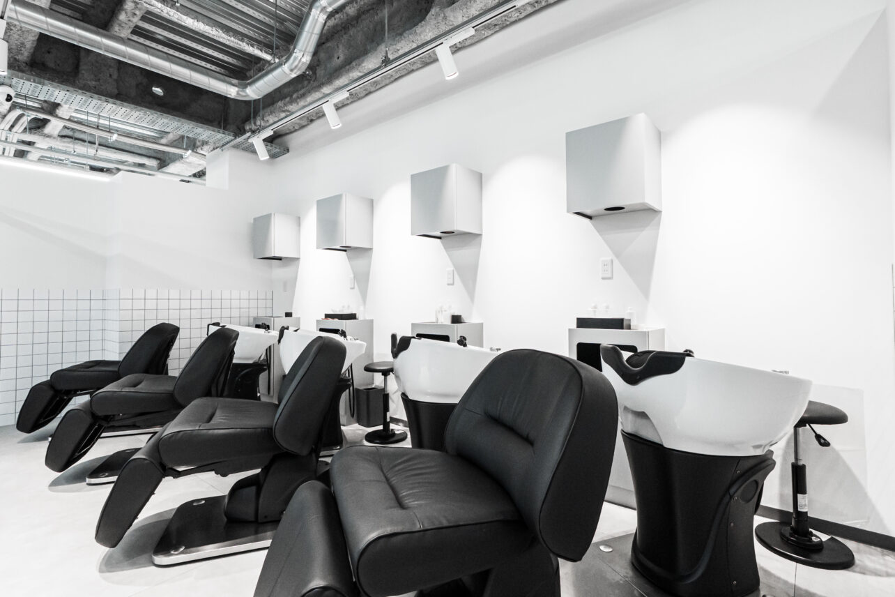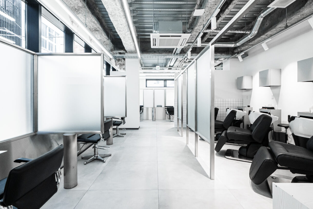 店内は、スタイル撮影に適した内装・素材・照明計画を取り入れ、すりガラスの個室仕切りにより奥行きのある写真表現も可能。ラウンジスペースとカラーラボも独立して配置しており、働きやすさを徹底的に追求した空間設計です。