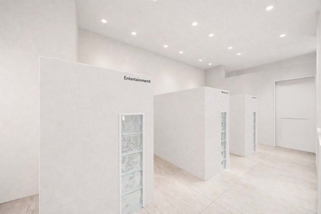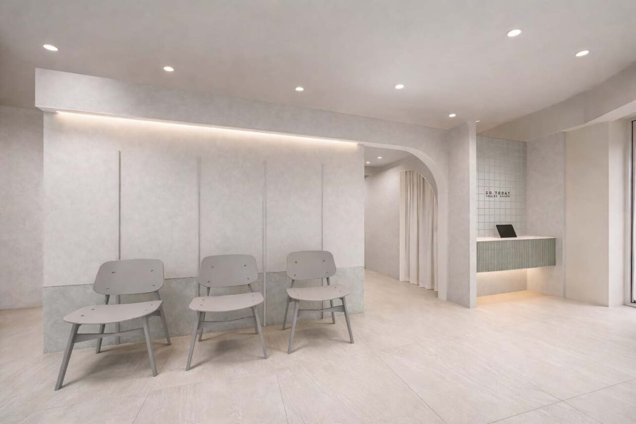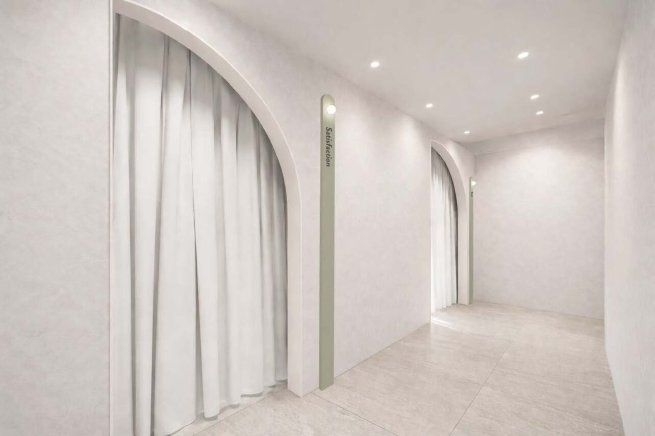 内装はモダンでミニマルなデザインを基調とし、快適な個室ブーススタイルでプライベートな施術空間を確保。グレージュやホワイトを基調に、ウッド素材をアクセントとして加えることで、シンプルながらも温かみのある空間を演出しています。